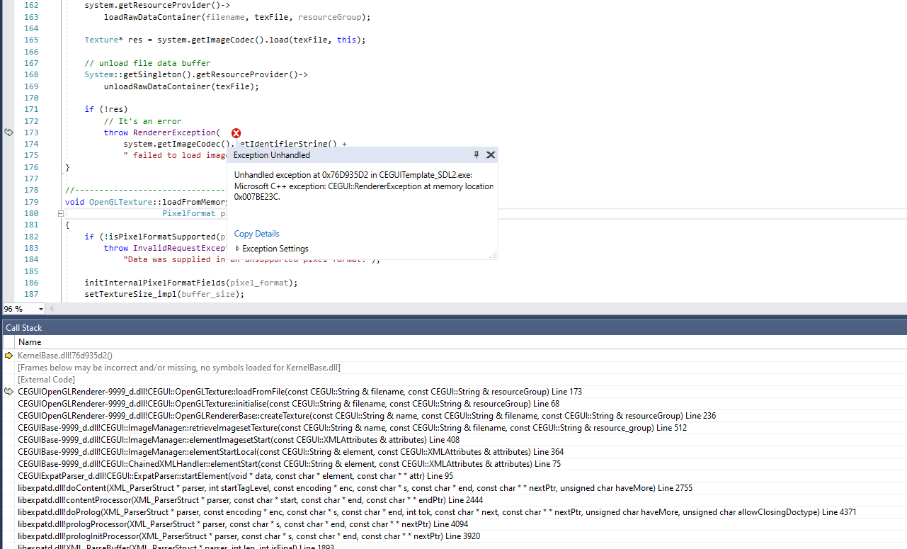 27/11/2019 22:34:41 (Error) CEGUI::RendererException in function 'void __thiscall CEGUI::OpenGLTexture::loadFromFile(const class CEGUI::String &,const class CEGUI::String &)' (C:\Users\Admin\Documents\Visual Studio 2017\Projects\lucebac-cegui-494cad0c4a90\cegui\src\RendererModules\OpenGL\Texture.cpp:175) : CEGUI::SDL2ImageCodec - Official SDL2 based image codec failed to load image 'TaharezLook.png'.